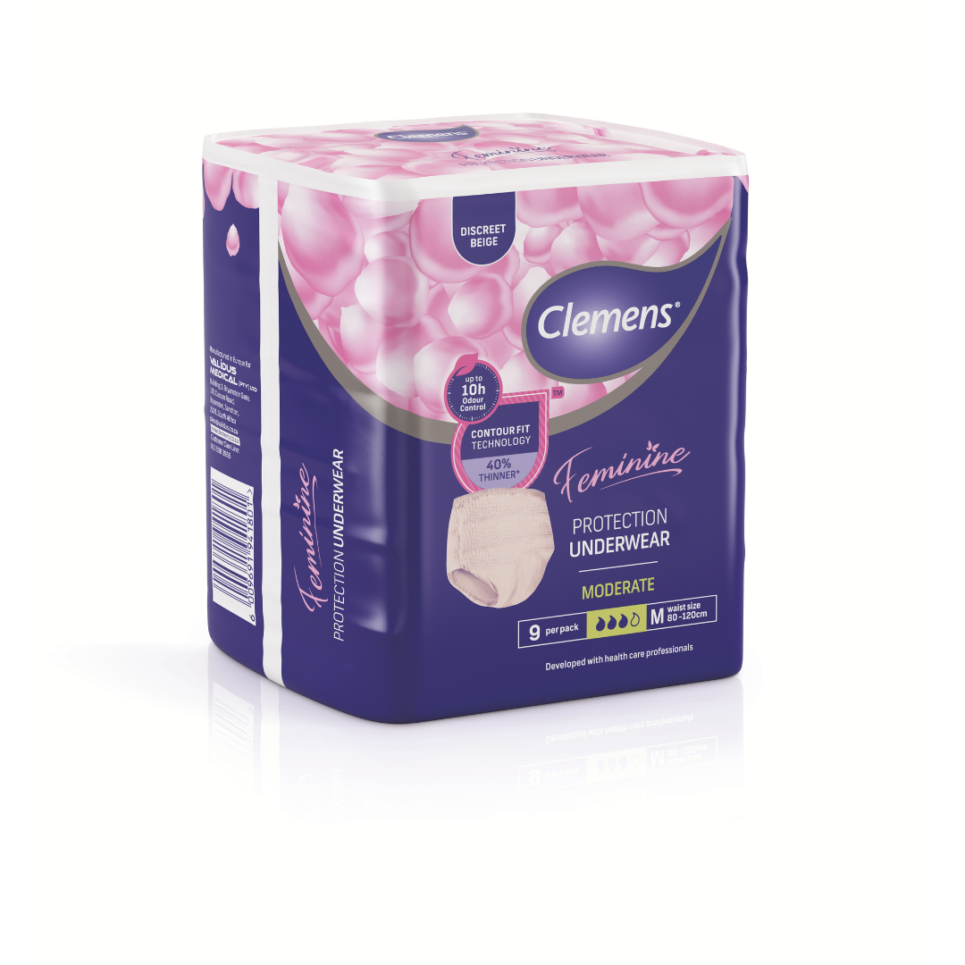 Designed to be worn like regular underwear, Clemens Feminine Protective underwear offers maximum security and comfort. The feminine protective underwear comes in a discreet beige colour, is 40% thinner than the unisex protective underwear, offers up to 10 hours of odour control, and has tearable side seams.